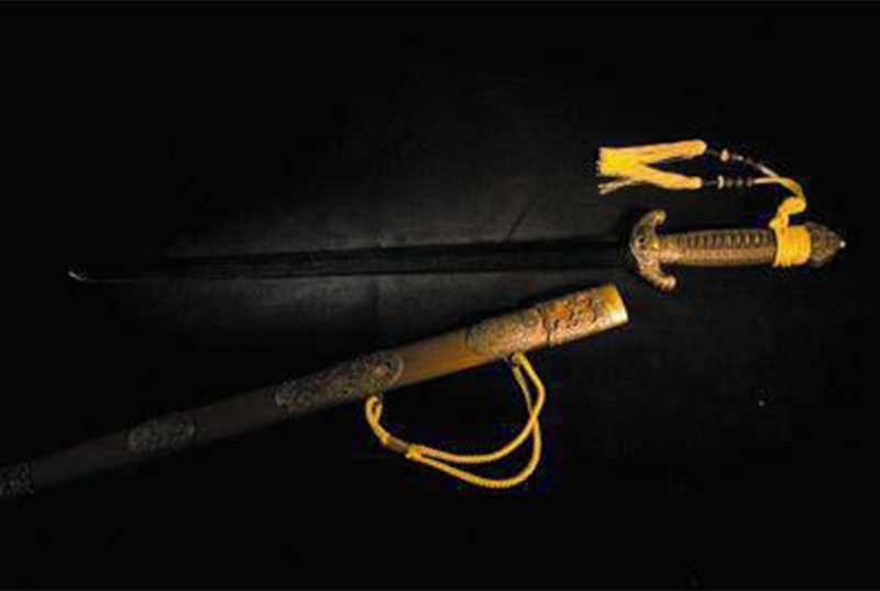 第四,纹饰巧致。剑身上刻有七星标志和飞龙图案。在剑身上刻花,也是龙泉剑的一项绝技。剑工们一不用彩笔,二不照图样,只用一把钢凿在宽不盈寸的剑身上刻凿,刻好后浇上铜水,经铲平加磨,飞龙图案,生动自然,永不消失。