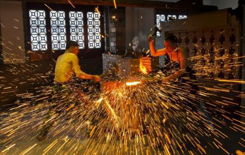 第三,寒光逼人。龙泉境内有一种名叫“亮石”的磨石。在这种石头上磨制出来的宝剑,寒光闪闪。龙泉宝剑全靠手工磨光,从粗磨、细磨到精磨,往往要花数日甚至数月之久,一旦磨出,青光耀眼。